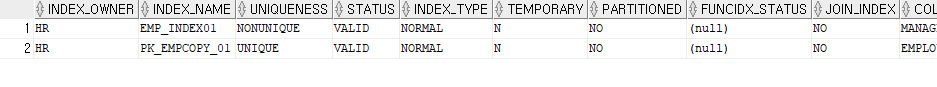 WHERE index_name IN('PK_EMPCOPY_01'); --이름으로 검색
