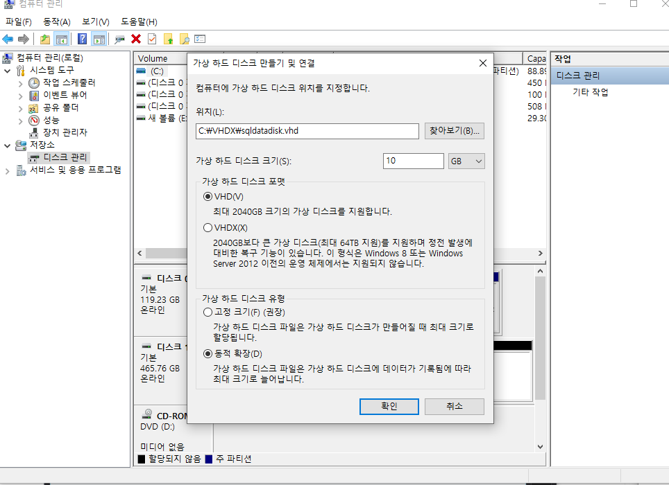 VHD와 동적확장을 설정하고 하드디스크 크기를 10GB로 설정한다.