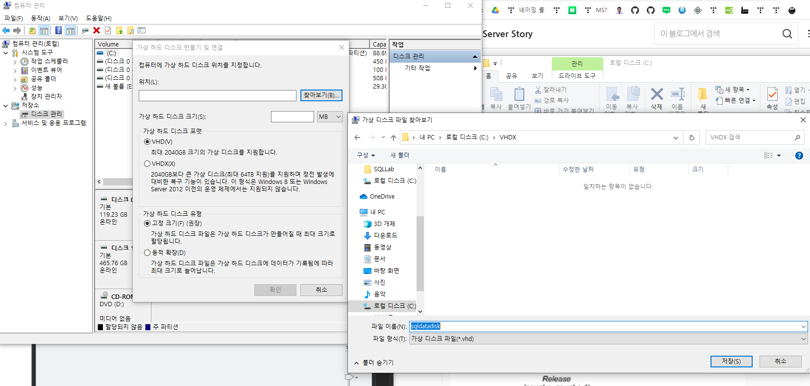 아래 창과같이 뜨면 위치를 탐색하여 VHDX라고 지정하고 파일이름을 sqldatadisk라고 저장한다.
