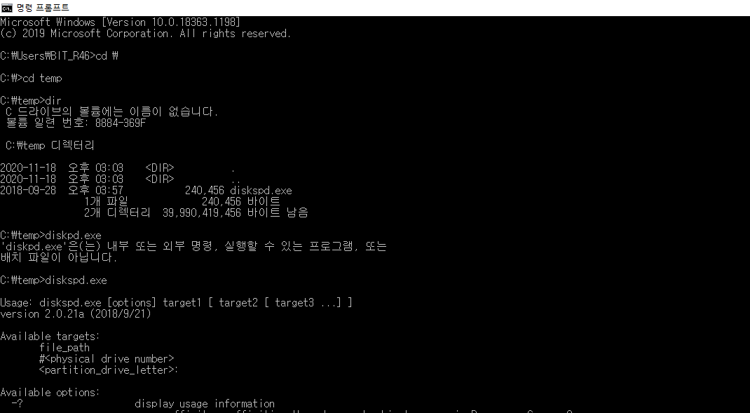 - ‘diskspd.exe /?’ 명령을 이용하여 전체 옵션을 확인할 수 있습니다.