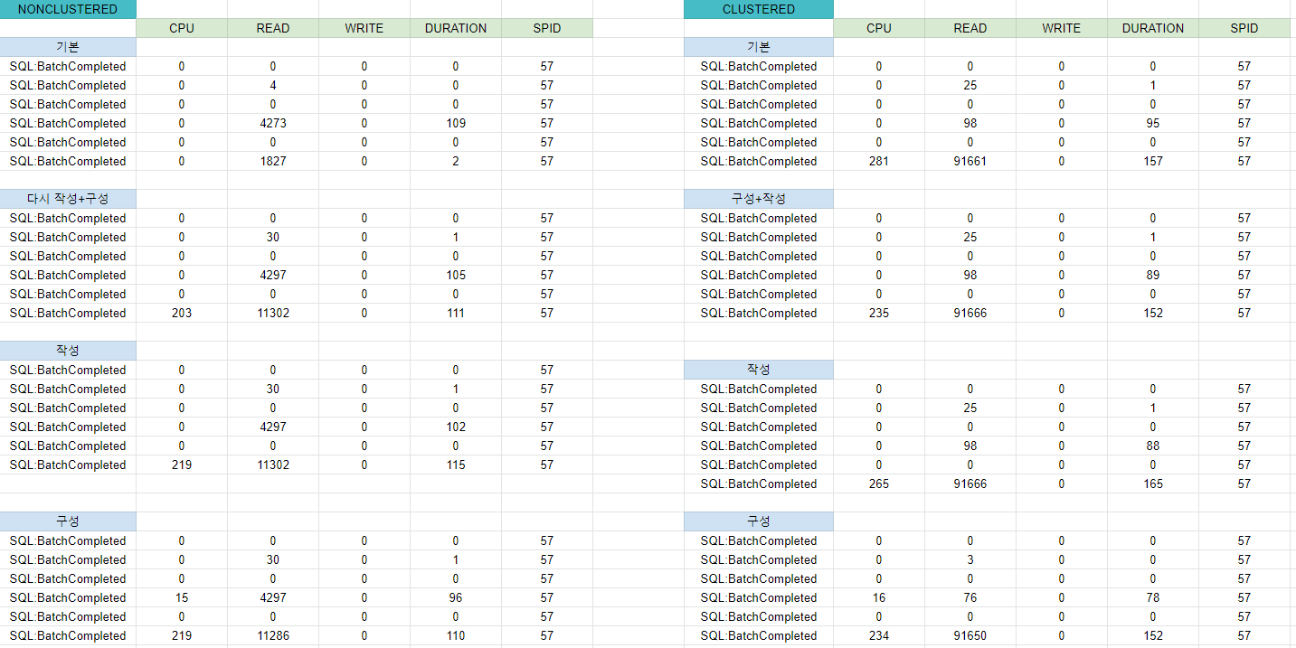 NONCLUSTERED/CLUSTERED별로 위의 내용을 정리해서 엑셀에 모아 둘 것이다.