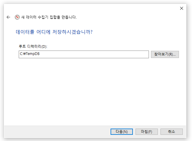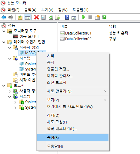 성능 모니터를 켜서 사용자정의에서 '새로만들기' -> '데이터 수집기 집합'을 선택하여 새로 만든다.