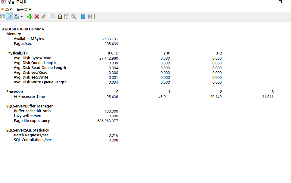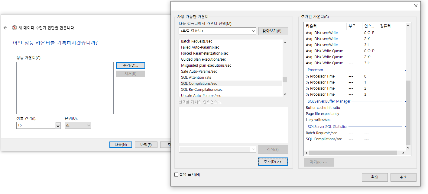 메모리, 디스크, 프로세서, sql server 버퍼매니저, sql server sql statistics에서 각각 해당하는 것들을 선택한다.