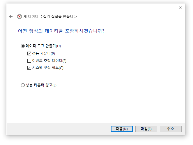 데이터로그 만들기의 '성능카운터'와 '시스템 구성정보'만 선택한다.